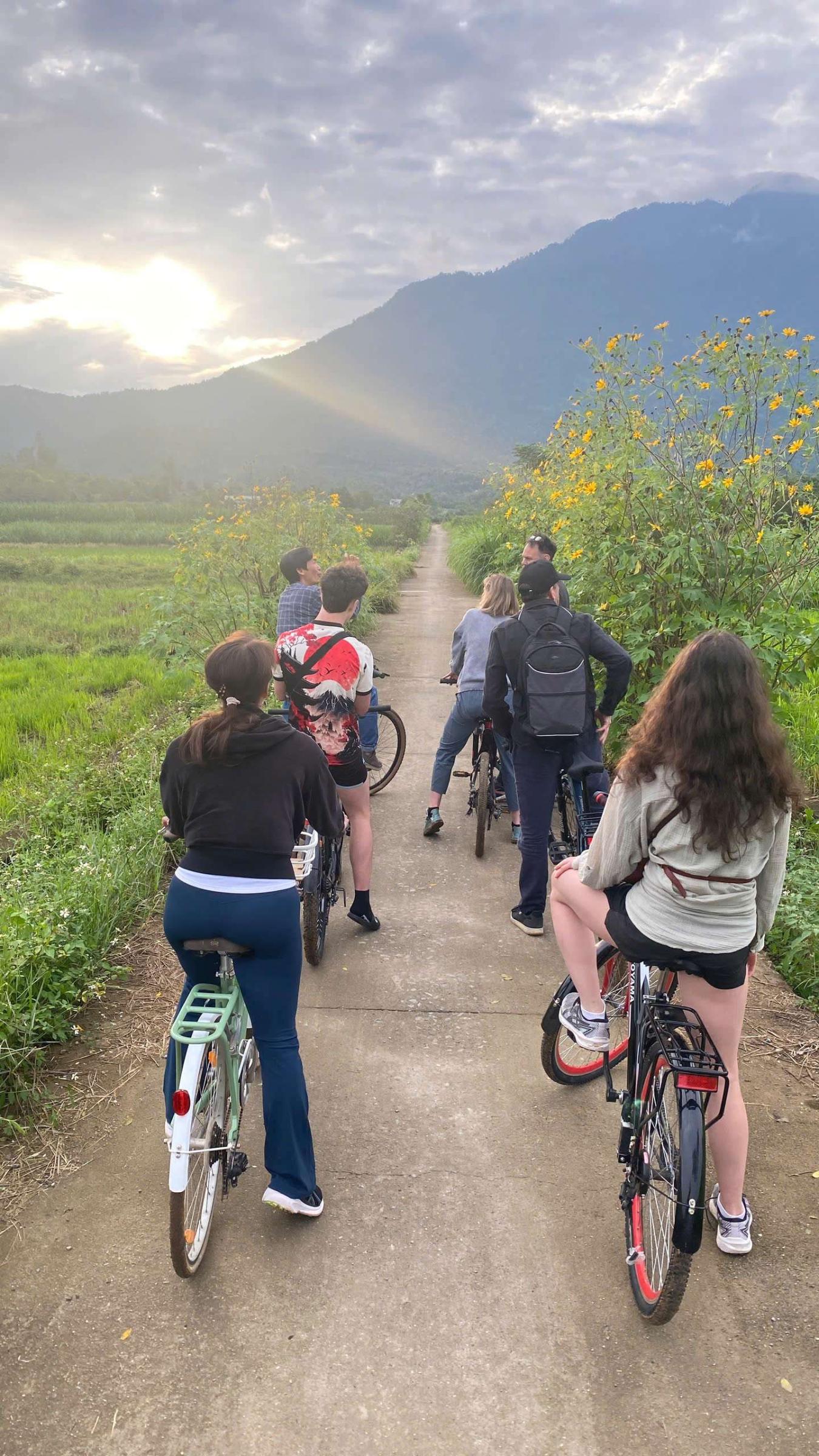 03:00 – 05:00 pm | Village Exploration (2. Hours) Family member will show you around the villages by bicyle, following quiet paths through rice fields, farms, and residential areas. Depending on daily village life, you may: Visit local homes and interact with villagers Observe or join farmers at work in the fields Stop by a village temple or communal house Meet children at a school or playground Experience spontaneous cultural moments such as a local gathering or celebration Every visit is unique, organic, and unscripted.